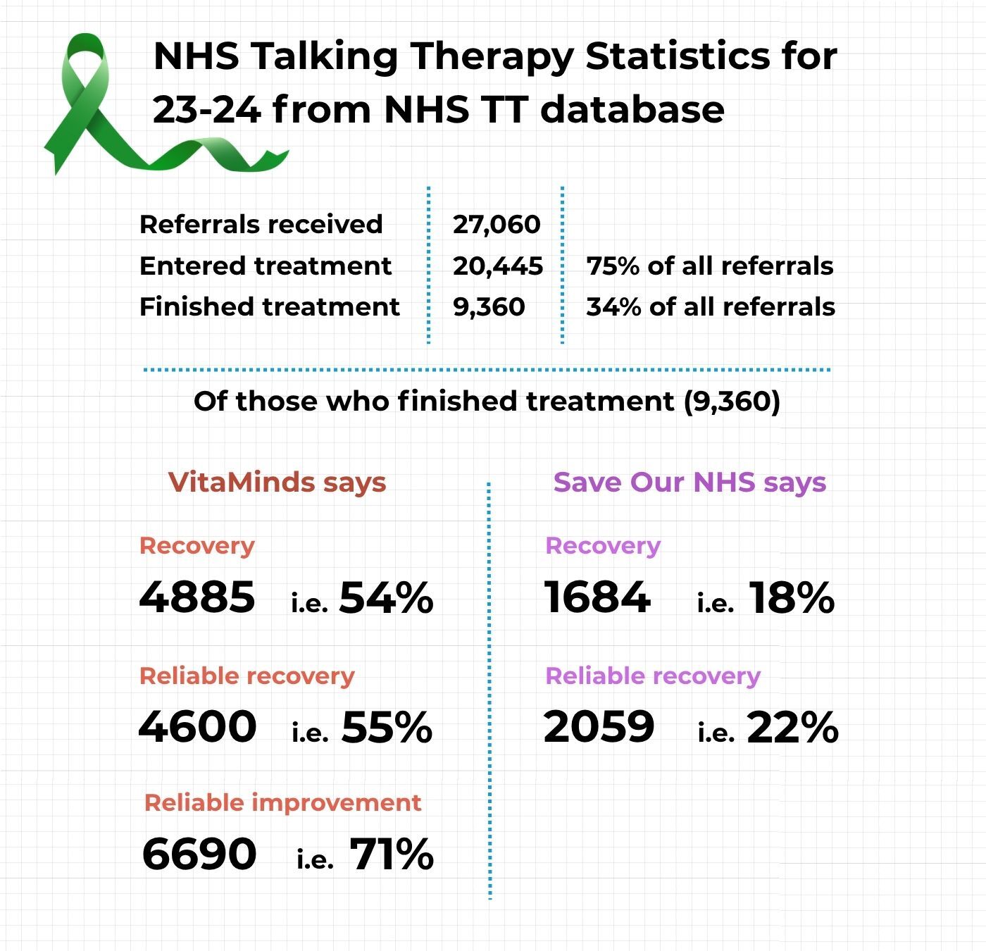 According to the NHS database, last year, two thirds of people who asked for help dropped out of treatment. Of those who started treatment and finished it, VitaMinds claims a ‘reliable recovery’ rate of 55%. However, from analysing their data, we believe it is actually 22%.