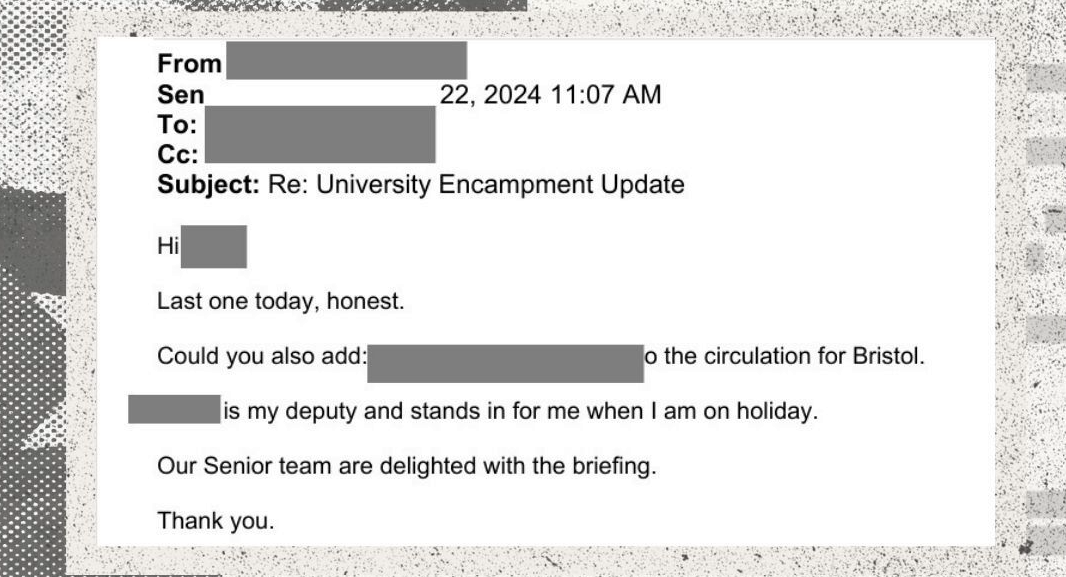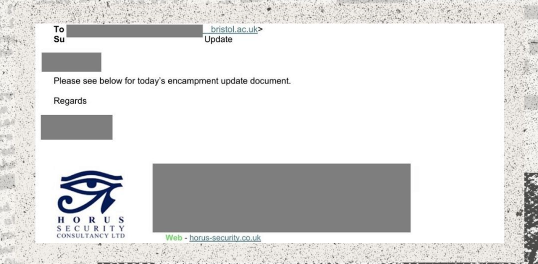 Internal emails between the university and the security firm show that between October 2024 and March 2025, Horus sent Bristol 21 weekly “Insight” briefings. The university even provided the firm with a list of student protest groups it wanted the firm to monitor, including pro-Palestinian and animal rights activists groups.